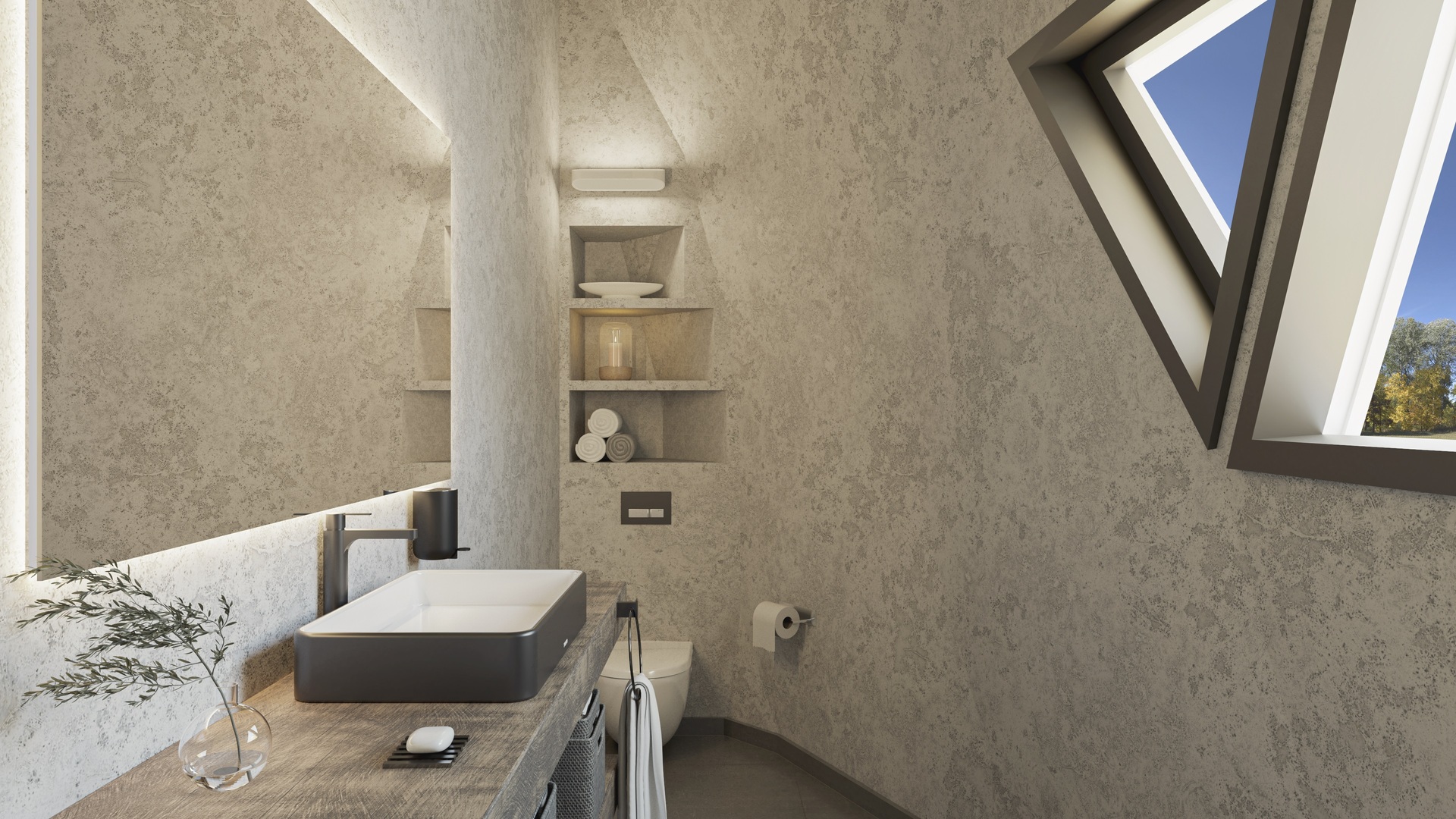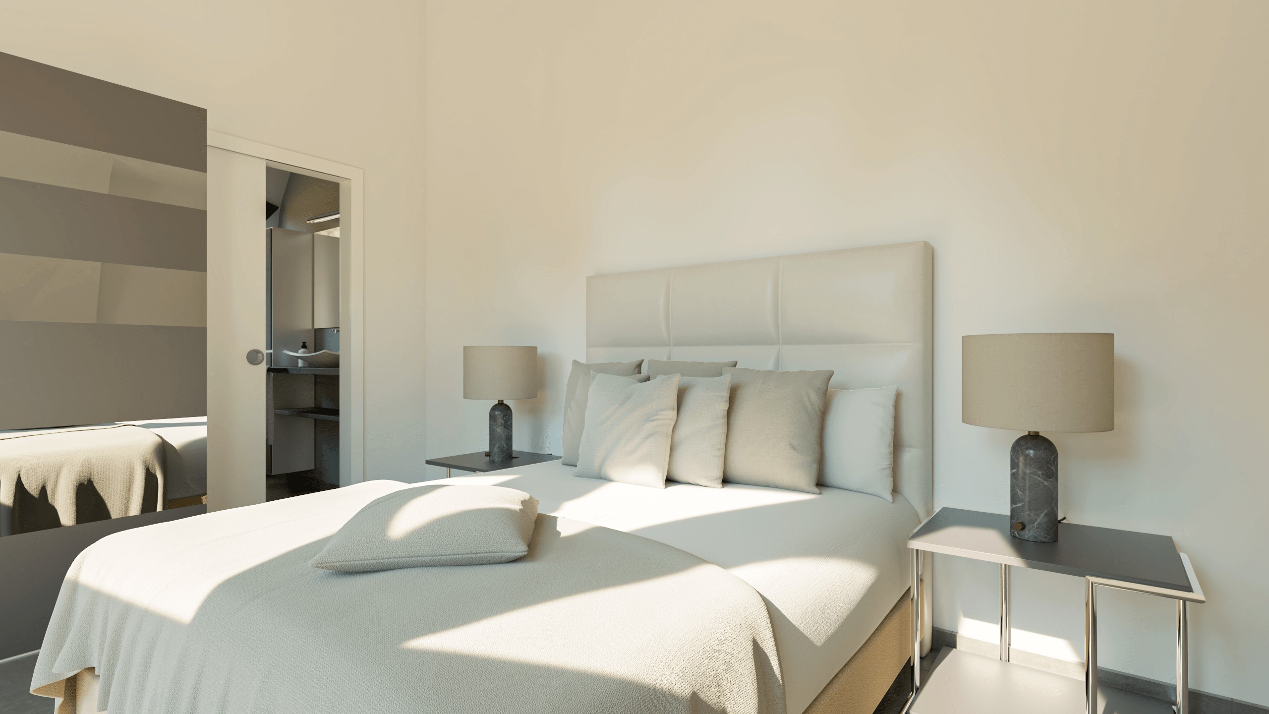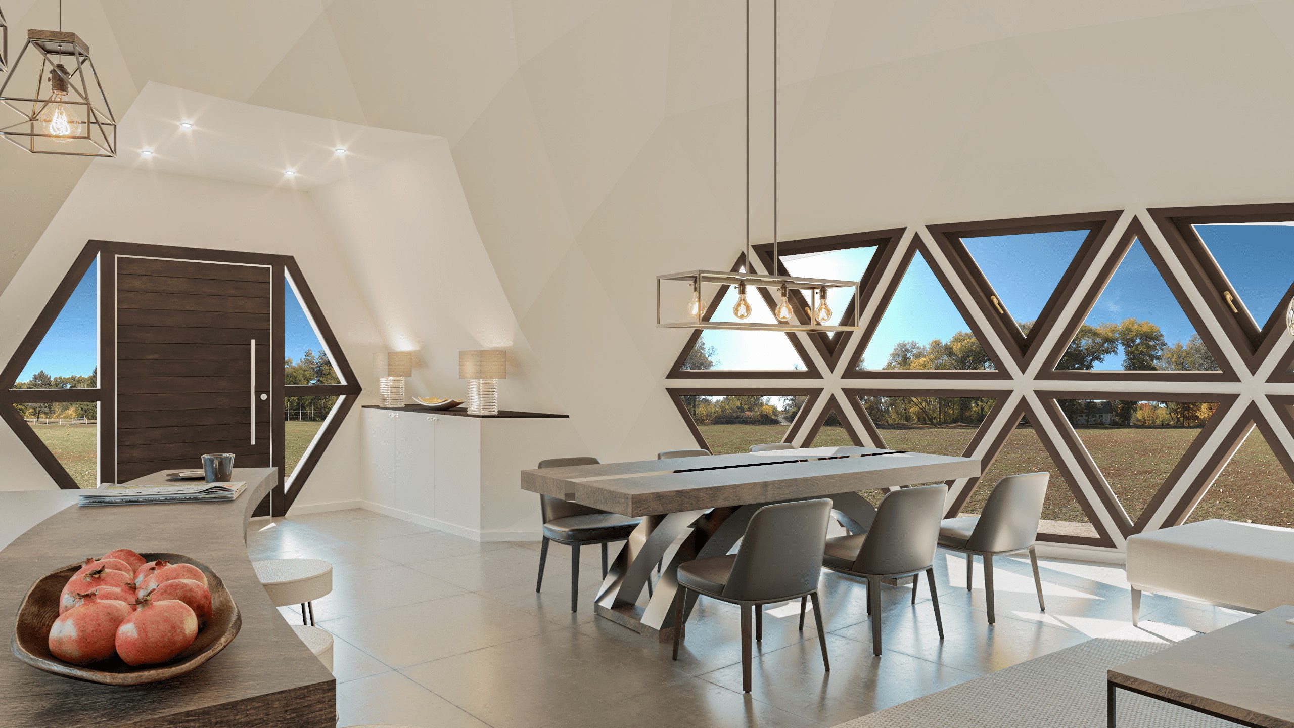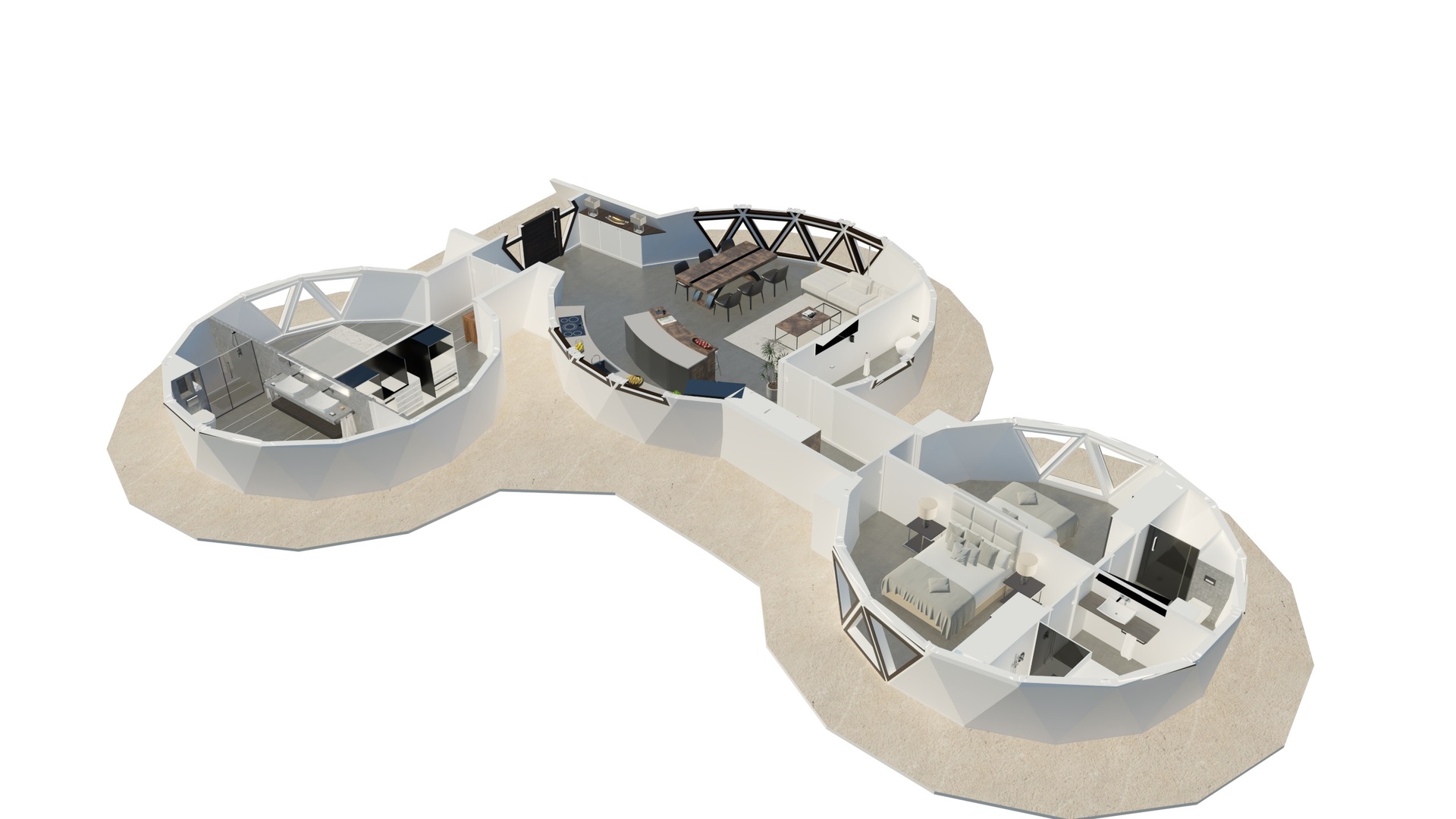Modelo Altea es una vivienda geodésica en planta baja de 157m² con tres cúpulas adosadas. Tres dormitorios y dos baños. Una cúpula principal con salón-comedor-cocina de concepto abierto, un amplio ventanal panorámico orientado al sur, y un baño. Una cúpula adosada con dos amplios dormitorios. Y una segunda cúpula adosada con dormitorio en suit con baño privado y vestidor.