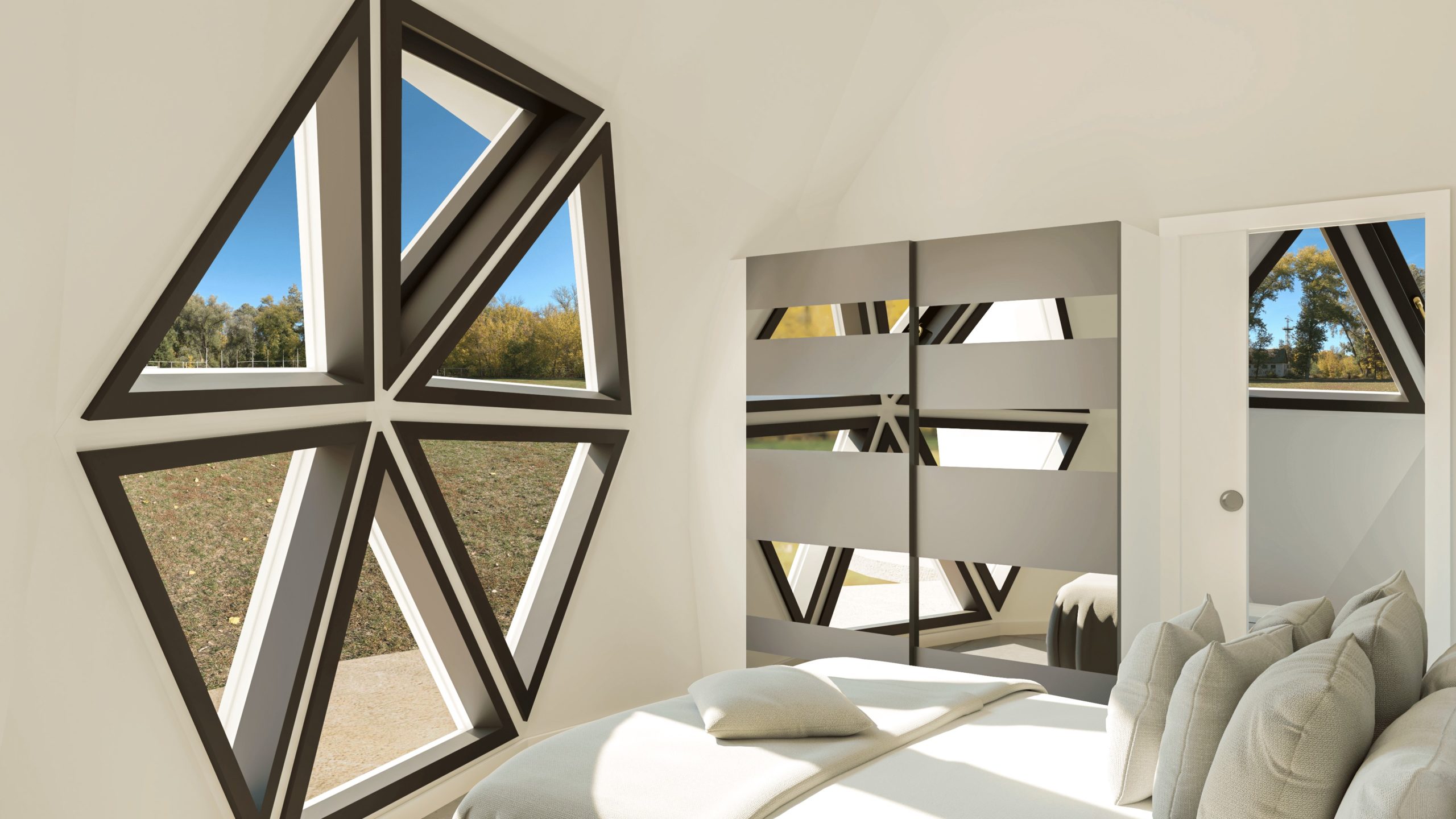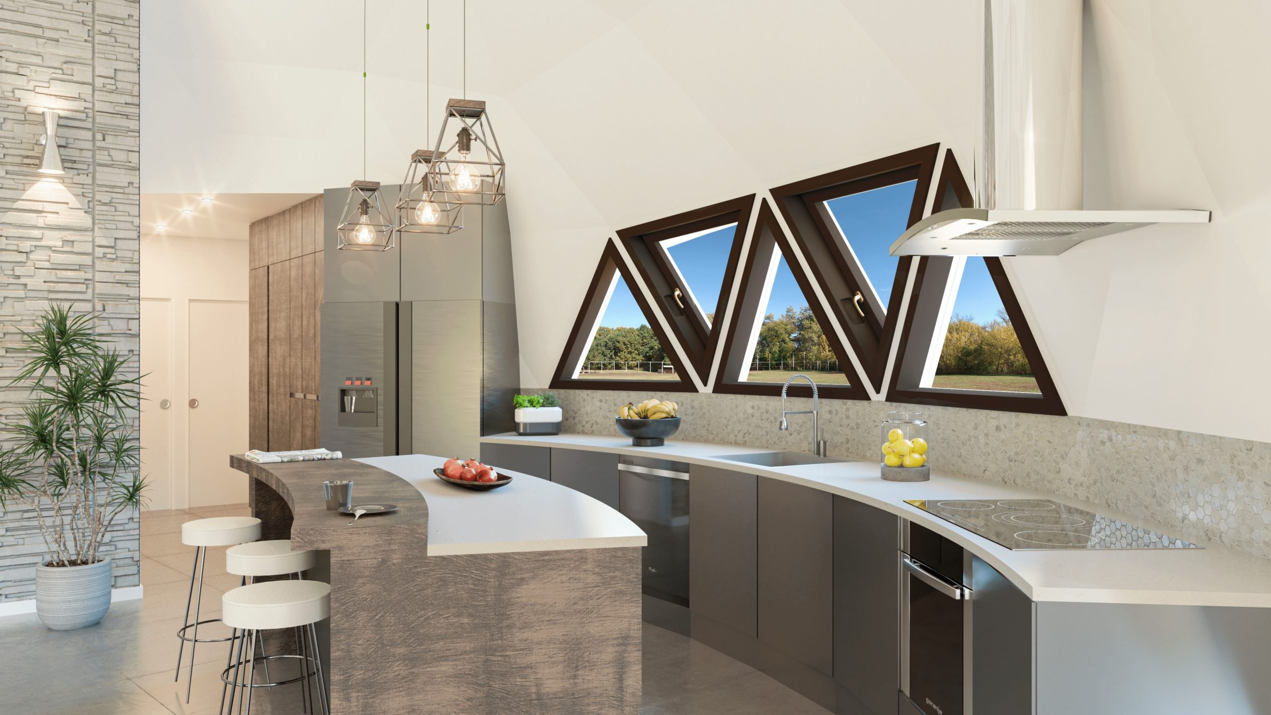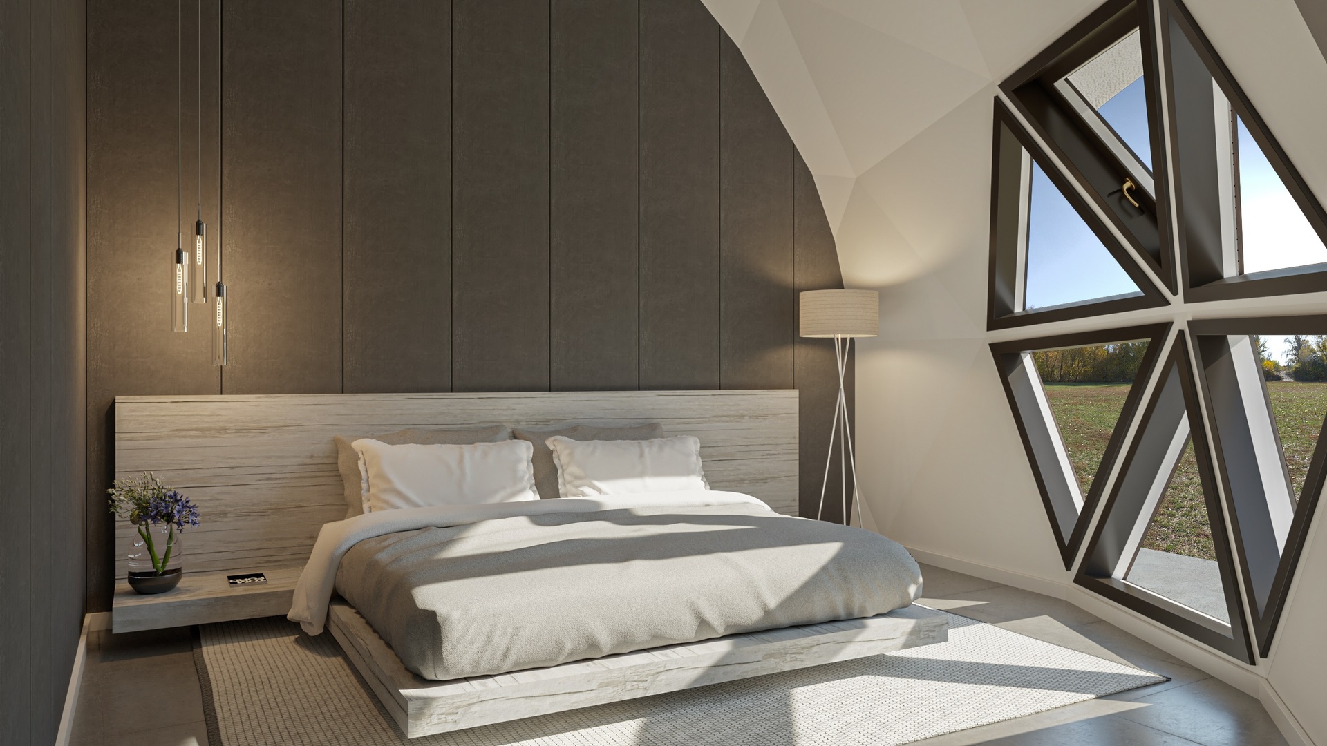 Modelo Altea es una vivienda geodésica en planta baja de 157m² con tres cúpulas adosadas. Tres dormitorios y dos baños. Una cúpula principal con salón-comedor-cocina de concepto abierto, un amplio ventanal panorámico orientado al sur, y un baño. Una cúpula adosada con dos amplios dormitorios. Y una segunda cúpula adosada con dormitorio en suit con baño privado y vestidor.