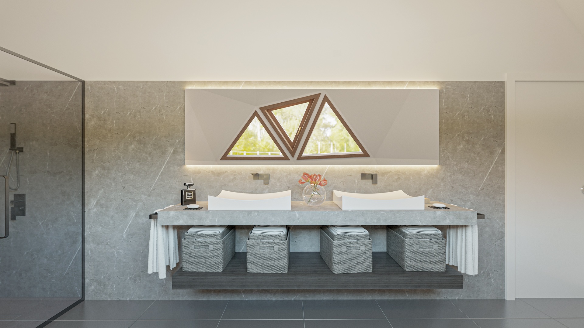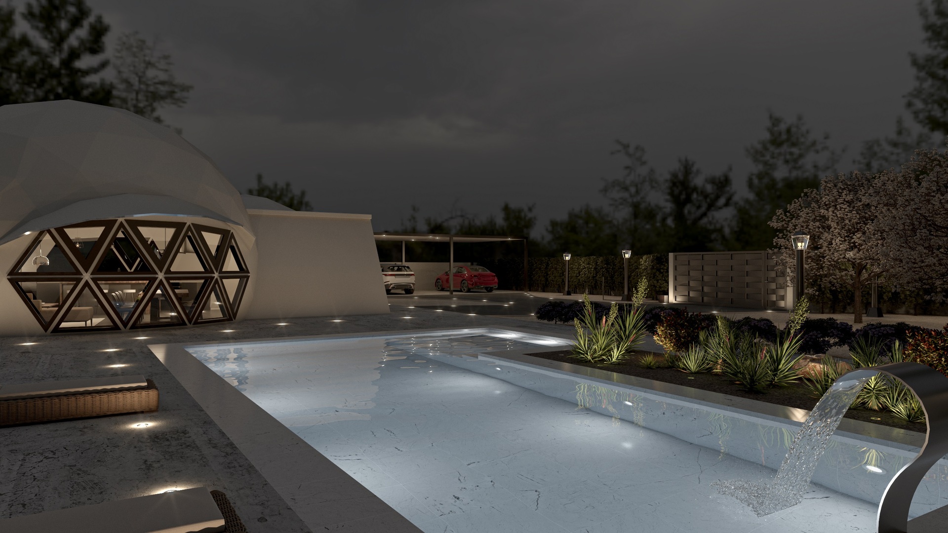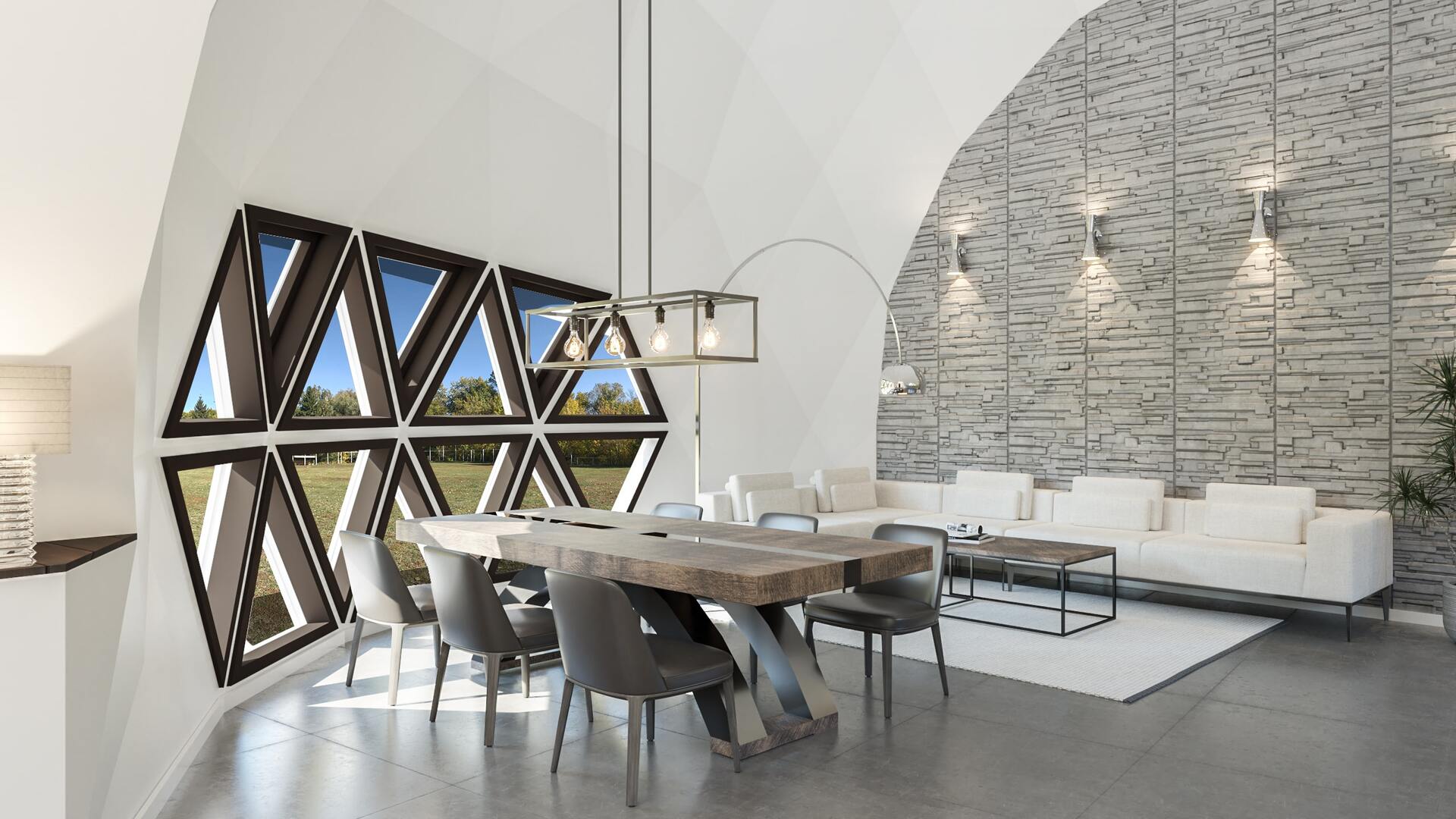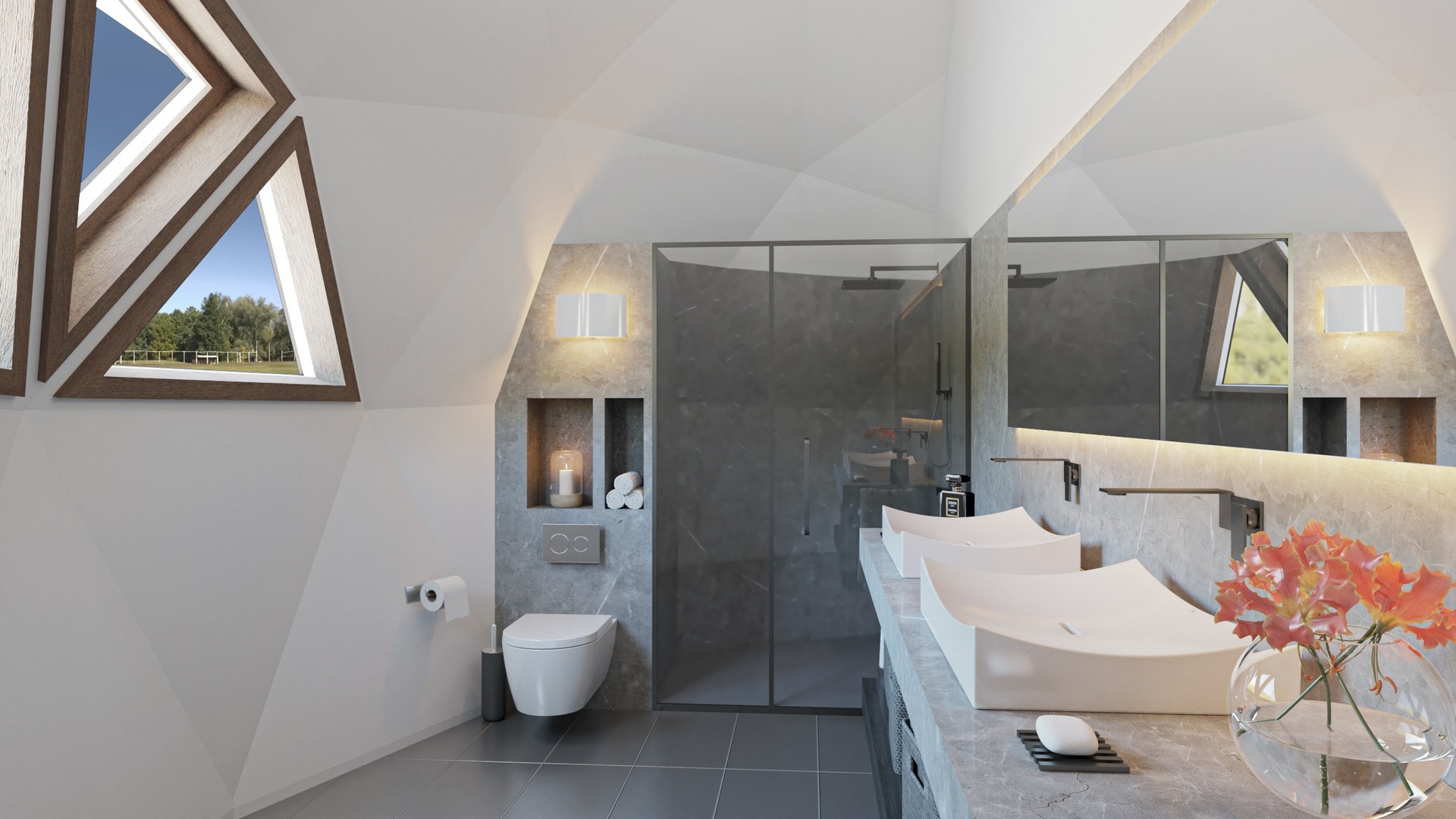 Modelo Altea es una vivienda geodésica en planta baja de 157m² con tres cúpulas adosadas. Tres dormitorios y dos baños. Una cúpula principal con salón-comedor-cocina de concepto abierto, un amplio ventanal panorámico orientado al sur, y un baño. Una cúpula adosada con dos amplios dormitorios. Y una segunda cúpula adosada con dormitorio en suit con baño privado y vestidor.